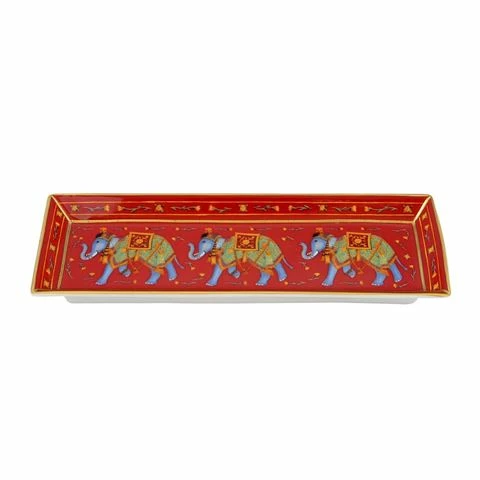 This stunning English fine bone china pen tray is in the style of one of Halcyon Days’ most popular designs, the Red Ceremonial Indian Elephant. Featuring a hand gilded rim and marching elephants adorned with heavy and vibrant embellishments, this opulent gift is a chic addition to any home and any desk.