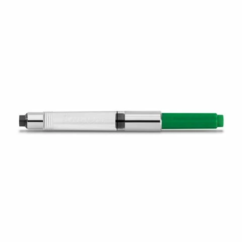 The Palm Green Standard Converter with chrome accents, fits all long Kaweco fountain pens. Instead of two ink cartridges, the converter is inserted into the barrel of the fountain pen. This makes it easy to fill up ink from an ink bottle. Multiple filling in succession increases the filling quantity. Unlike conventional ink cartridges, which end up in the trash after the ink has been used, it can be permanently reused and refilled again and again.
